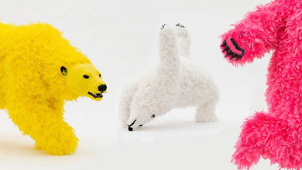 1. Three polar bears covered in bird feathers, posing and in movement on an off-white background; one in yellow, one in pink and one in white.