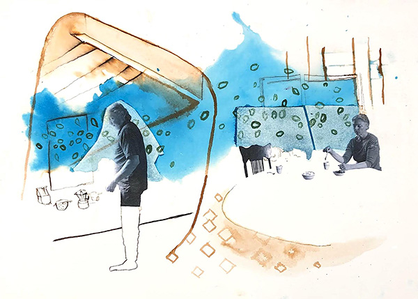 Pierre St-Jacques, 36 Steps on a Curved Road – Kitchen Scene, 2015, Ink and transfer on paper, 10 1/4″ x 14 1/8″