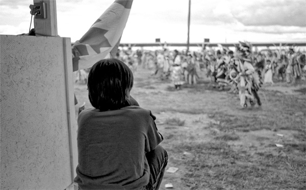 Jeff Thomas, Young Boy Watching the Powwow, Long Plains Powwow, Manitoba, c. 1989, silver gelatin print. Courtesy of the artist.