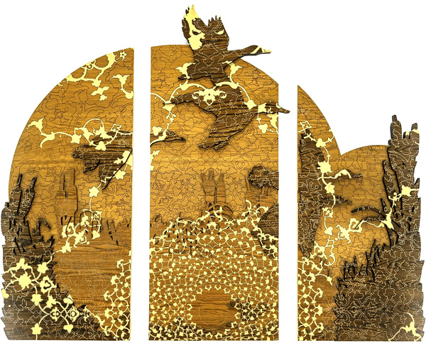 2. A wall work in laser-etched wood features mallards and reeds, overlaid by complex patterning in gilt in this artwork by Soheila Esfahani.