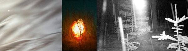 3. A long horizontal image collaging three artworks by artists Emilio Portal, Samuel Choisy, and Lise Beaudry, showing rippling water, a mysterious fireball, and night footage taken from a trail cam in a wooded property.