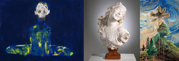 Top (left to right): Nathan Eugene Carson (Canadian b. 1980), Praying Hands (Meditation), 2014, mixed media on paper. Purchase, Permanent Collect Fund, 2021. Photo: Mike Lalich, 2024. Jean-Baptiste Carpeaux (French 1827-1875), Bacchante aux Roses, after 1868, plaster with painted base. The Joey and Toby Tanenbaum Collection, 2002. Photo: WaveLength, 2004. Emily Carr (Canadian 1871-1945), Sunshine and Tumult, 1939, oil on paper. Bequest of H. S. Southam, Esq., CMG, LL.D, 1966. Photo: Mike Lalich, 2008.