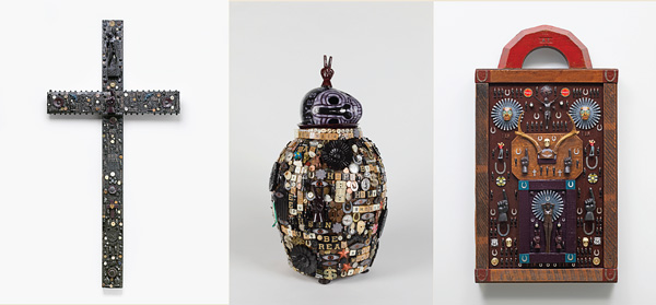 Bottom (left to right): Jan Wade, Church and State, 1990–20, wood, metal, plastic, shell, found objects, paint. Collection of the Vancouver Art Gallery, General Acquisition Fund. Photo: Ian Lefebvre, Vancouver Art Gallery. Jan Wade, Memory Jug, 2016. acrylic, found objects. Collection of Surrey Art Gallery, Photo: Dennis Ha. Jan Wade, Prophecy, 1990–20. wood, metal, plastic, found objects, paint. Collection of the Vancouver Art Gallery, General Acquisition Fund, Photo: Ian Lefebvre, Vancouver Art Gallery.