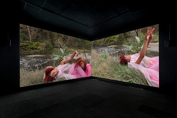Jessica Karuhanga, being who you are there is no other, 2018, two-channel video projection. Photo courtesy of KWAG, by Toni Hafkenscheid. Jessica Karuhanga: Blue as the insides, Kitchener-Waterloo Art Gallery, April 8 – August 6, 2023.