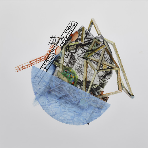 Yael Brotman, The World is a very Narrow Bridge 13, 2025, etching, collage; archival inkjet print and stenciling on Hahnemühle paper, 15″ x 15″
