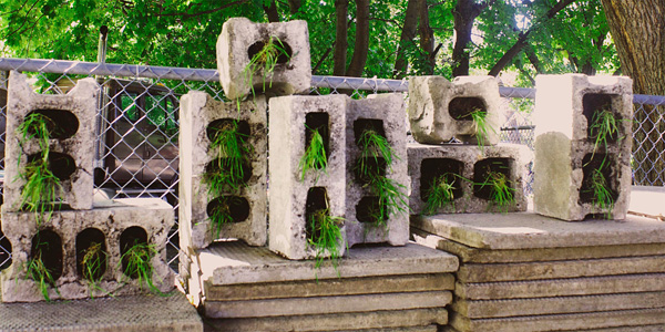 Melanie Billark, Habitat Fragmentation, 2014. Found cinder blocks, soil, barley wheat grass.