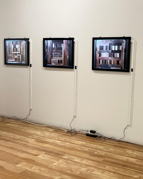 Installation view, Lock Ups, 2024. Digital photos on transparent film in lightboxes, 18” x 24”. Photo courtesy of the artist.