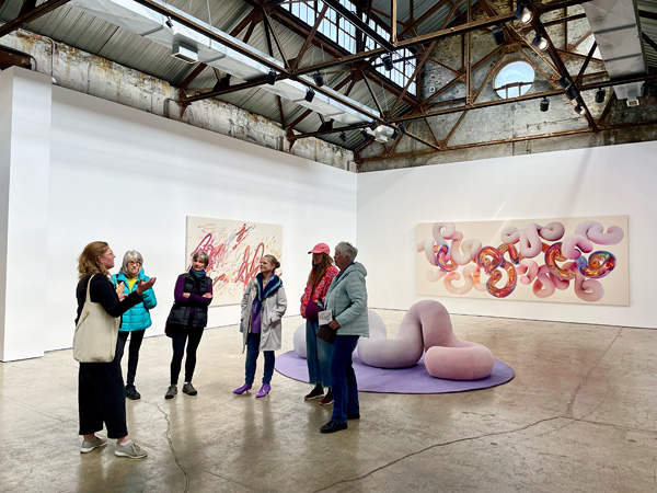 © Sarah Pereux. Mackenzie Sinclair (ADAC) speaking to a group touring with Odessa Paloma Parker (Opaloma) during Vickie Vainionpää’s show Gaze Paintings at Olga Korper Gallery in Toronto, during Canadian Art Hop 2024.