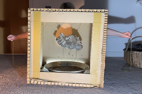 1. A cardboard box with a silver tray and a grey cloud in it made of soaked cheesecloth is seen inside a bedroom with carpeted floors and a wicker basket. A person’s arms appear from behind the box pulling strings that release water from the cloud.