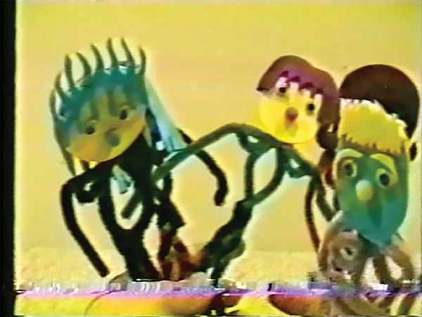 2) Slightly distorted video still of hands holding a group of homemade figures, crafted of pipecleaners, googly eyes, and other mixed media, against a yellow background.