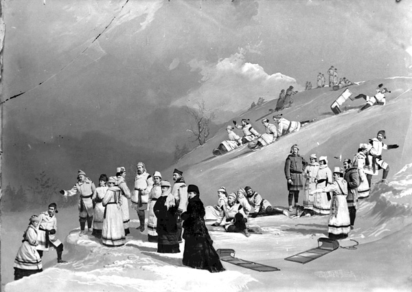 William James Topley, Composite — Tobogganing party (Mrs. Alexander Mackenzie and daughter), c.1870s, composite photograph from glass plate negative. Library and Archives Canada, a012417