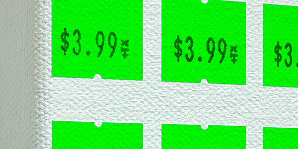 Sean Weisgerber’s new series of wall drawings stems from his ongoing Price Per Square Inch series of paintings. At Open Studio, the artist will execute the first work in this series, Wall Drawing #1, using a price gun to place fluorescent pink price stickers in each square inch of the gallery walls’ surface. Each sticker is marked with the date it was executed and its price, breaking down the CARFAC exhibition fee paid to the artist by Open Studio into 11,520 units.