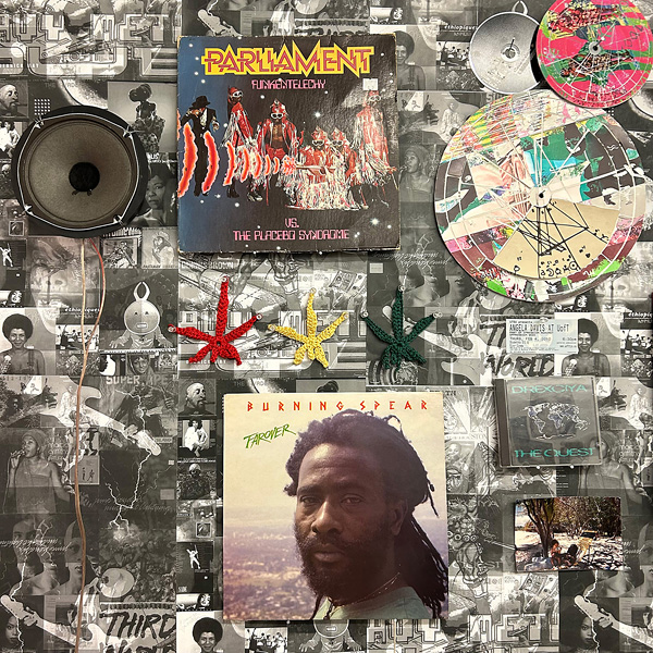 2) Charlie Star, Afrosonic Listening Lounge (detail), 2024, mixed media wall installation. Photo: courtesy of the artist. Description: A densely packed wall featuring LP covers by Parliament and Burning Spear alongside modified discs, posters, speaker heads, ticket stubs, and ephemera.
