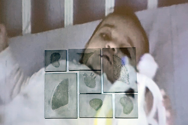 Heidi McKenzie, Detail of Lurking (2020), variable dimensions, 15 min video projection with sound on 7 pieces of wall mounted stoneware.