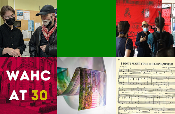 Images, top left: Ada Bierling and Karl Beveridge view objects from WAHC’s collection. Top right: VALU Community Projects, House of 9 Dragons. Bottom centre: Natalie Hunter, In The Shadow of Rust 01, detail (2024). Bottom right: Sheet music for I Don’t Want Your Millions, Mister, by Jim Garland.