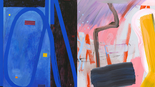Image details (left to right): Ron Shuebrook, Black Mountain, Blue Monkeyrope (detail), 2021, acrylic on canvas, 213.3 × 121.9 cm; Frances Thomas, Stuck in a Good Place (detail), 2022, acrylic on panel, 50.8 × 40.6 cm. Collections of the artists. Photos by Joseph Hartman.