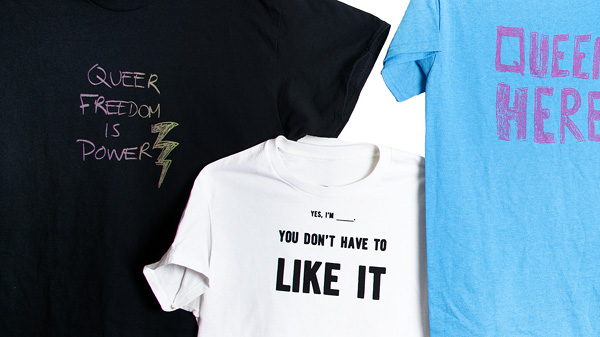 Image details: Screen-printed t-shirts produced by participants in the Queer Print Project. Photo by Anna Gaby-Trotz.