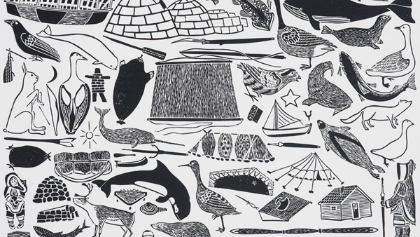 Image details: Kananginak Pootoogook, The Inuit World (detail), 1977, block print on paper, 18.4 × 26 cm. Gift of A.R. MacKinnon in memory of Gene MacKinnon, 2011. Macdonald Stewart Art Centre Collection at the Art Gallery of Guelph.