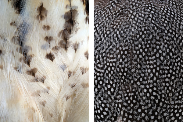 Thaddeus Holownia, Red Tailed Hawk, 2022 (left), Guinea Fowl, 2022 (right), from the series of a feather, archival pigment prints, courtesy of the Artist and Corkin Gallery, Toronto