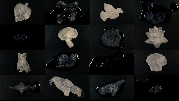 Solaris originates in a series of collaborative workshops the artists gave at Marshview Middle School and the Owens Art Gallery in 2023. Participants made single-line drawings, small relief sculptures, and evocative soundscapes exploring the ways water connects all living things. The artists then cast the resulting sculptures in ice, filming each one as it melted into a puddle of water. Through this process of transformation, the sculptures appear to rise like monumental icebergs from the sea only to melt again, suggesting both the beginning and the end of the world.