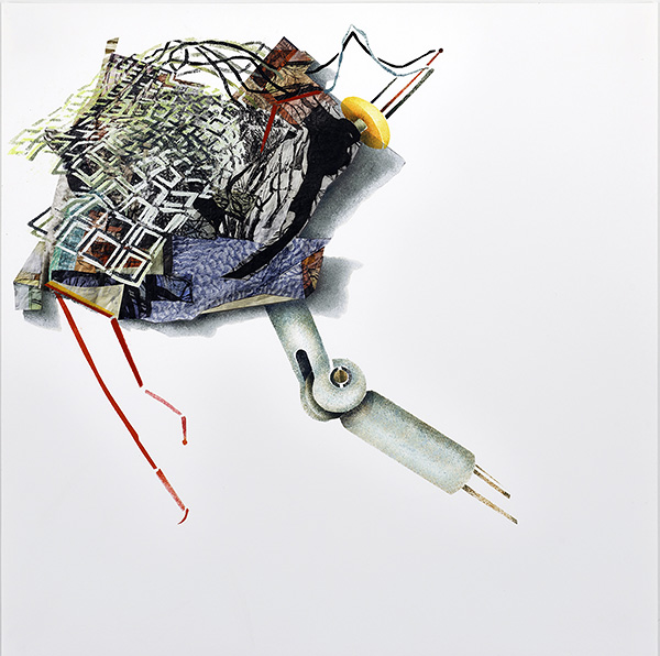 Yael Brotman, The Junk Drawer, 2024-25, etching on Kurotani paper, collage, archival inkjet printing, hand stencilling, 1/5 VE, 15″ x 15″. Photo: P. Legris