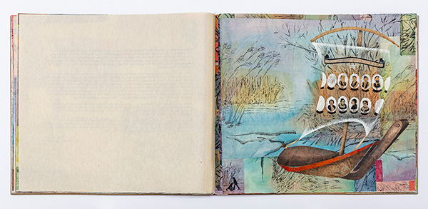 3. York boat on a river; portraits of clinic Founders on the sail; shoreline grasses; lower left corner, a person pushes a baby stroller.
